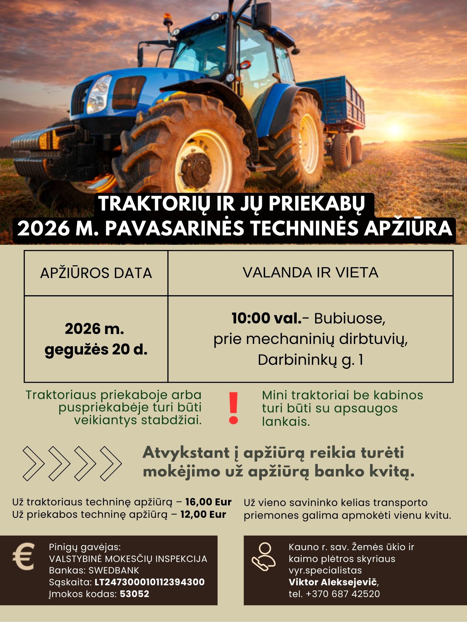 Traktorių ir jų priekabų 2026 m. pavasarinės techninės apžiūra
